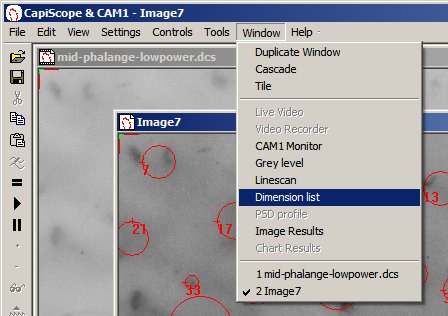 Each image in CapiScope® can have three separate dimension lists. Measurement output using the = key only include dimensions in the active Dimension List.