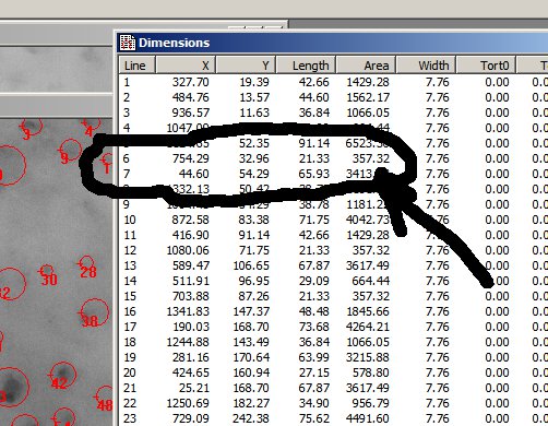 Each identified capillary is marked with a circle dimension line with an area the same as the identified capillary. You can see the individual areas by opening the dimension list window.